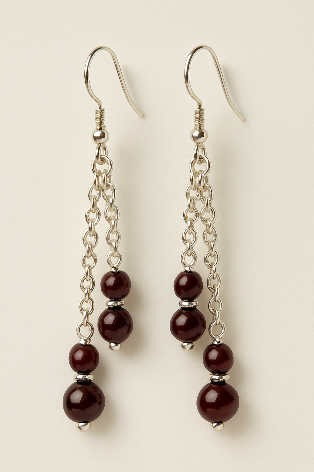 Add timeless charm to your accessory collection with these elegant Burgundy Beaded Drop Chain Earrings. Featuring rich burgundy glass beads cascading from silver-tone chains, these earrings offer lightweight movement and eye-catching style. Made with sterling silver ear wires and silver-tone findings, they're perfect for sensitive ears and everyday wear. Ideal for those who love artisan jewelry with a bold pop of color.