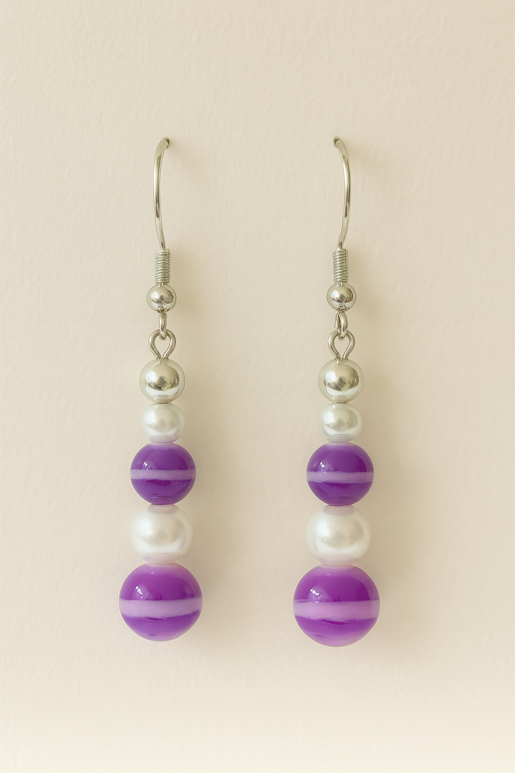 Add a pop of playful charm to your jewelry collection with these handcrafted Purple Swirl & Pearl Beaded Dangle Earrings. Featuring vibrant purple and white swirl glass beads paired with glossy faux pearl accents, these lightweight earrings exude a fresh, feminine flair. Made with sterling silver fish hook ear wires and silver-tone findings, these earrings offer both comfort and shine for all-day wear. Ideal for casual outfits or as a fun statement piece for any occasion.