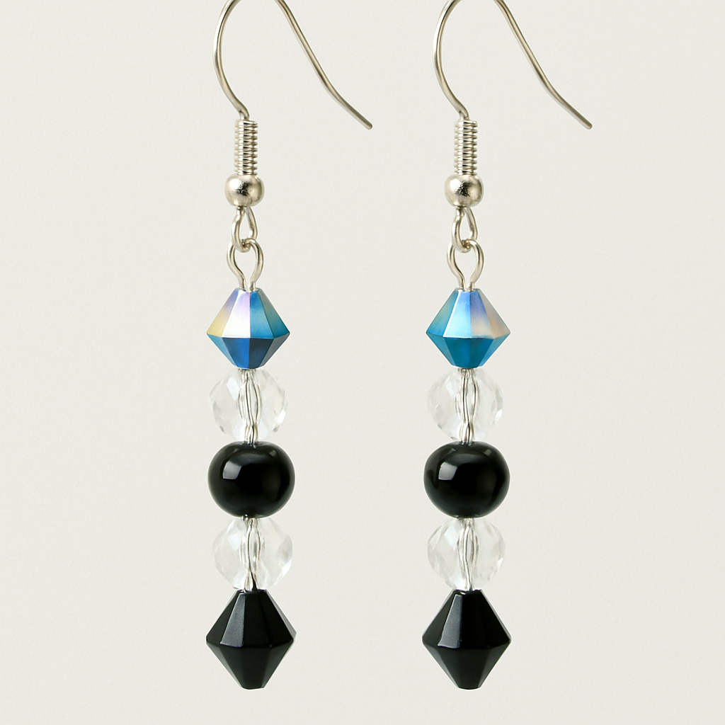Add bold sophistication to your accessories with these Prism Noir beaded earrings. Featuring faceted iridescent cones, glossy black rounds, and clear crystal-like glass beads, these earrings catch the light from every angle. Finished with sterling silver fish hook ear wires and silver-tone findings, they offer both shimmer and comfort. A perfect blend of classic black and sparkling flair, ideal for evening wear or dressing up your favorite outfit.