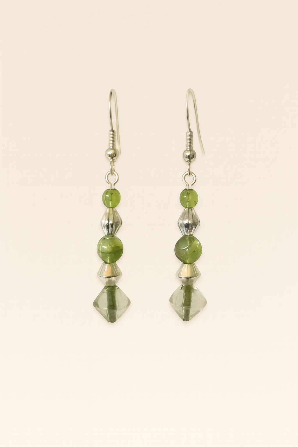 Add a refreshing pop of green to your jewelry collection with these handcrafted glass bead earrings. Featuring layered lime and olive-toned beads, these earrings are accented with silver-tone findings and sterling silver fish hook ear wires. Their bold color and natural aesthetic make them perfect for everyday wear or adding an earthy accent to special occasions.