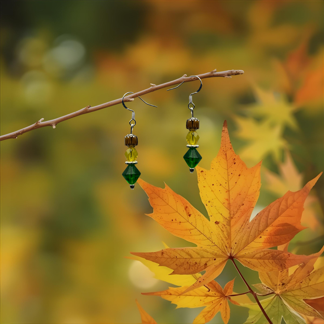 The Woodland Spark Earrings capture the essence of the forest in fall — rich green, golden amber, and earthy brown glass beads accented with silver-tone details. Handcrafted with sterling silver fish hook ear wires, these earrings shimmer in the light like morning sun filtering through the trees. Elegant yet casual, they pair beautifully with any cozy sweater or autumn outfit.