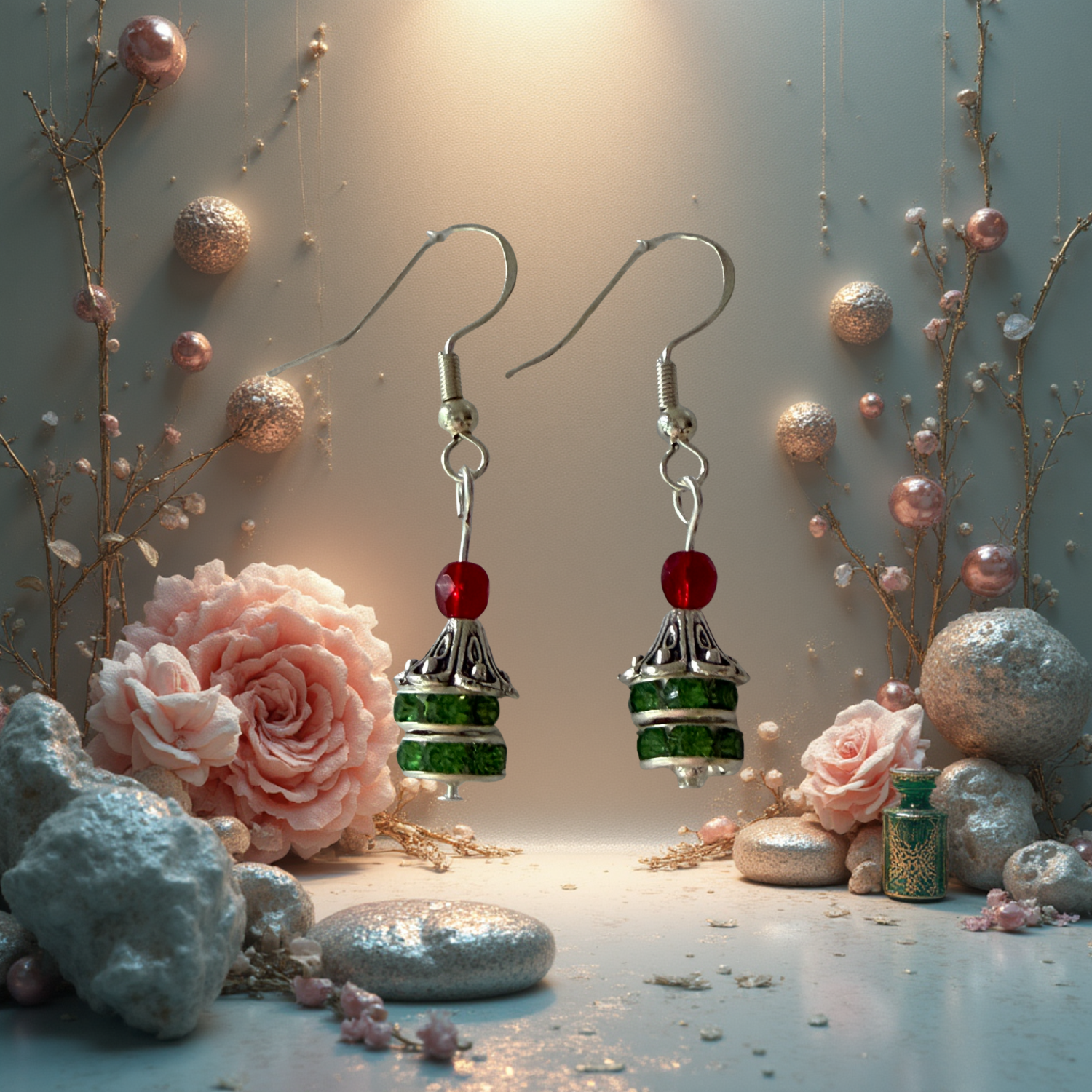 Add timeless Christmas charm to your look with these Mistletoe Magic Earrings. Crafted with rich green glass beads, ruby red accents, and elegant silver cone caps that give a vintage holiday feel. Perfect for dressing up your festive evenings with elegance and joy.