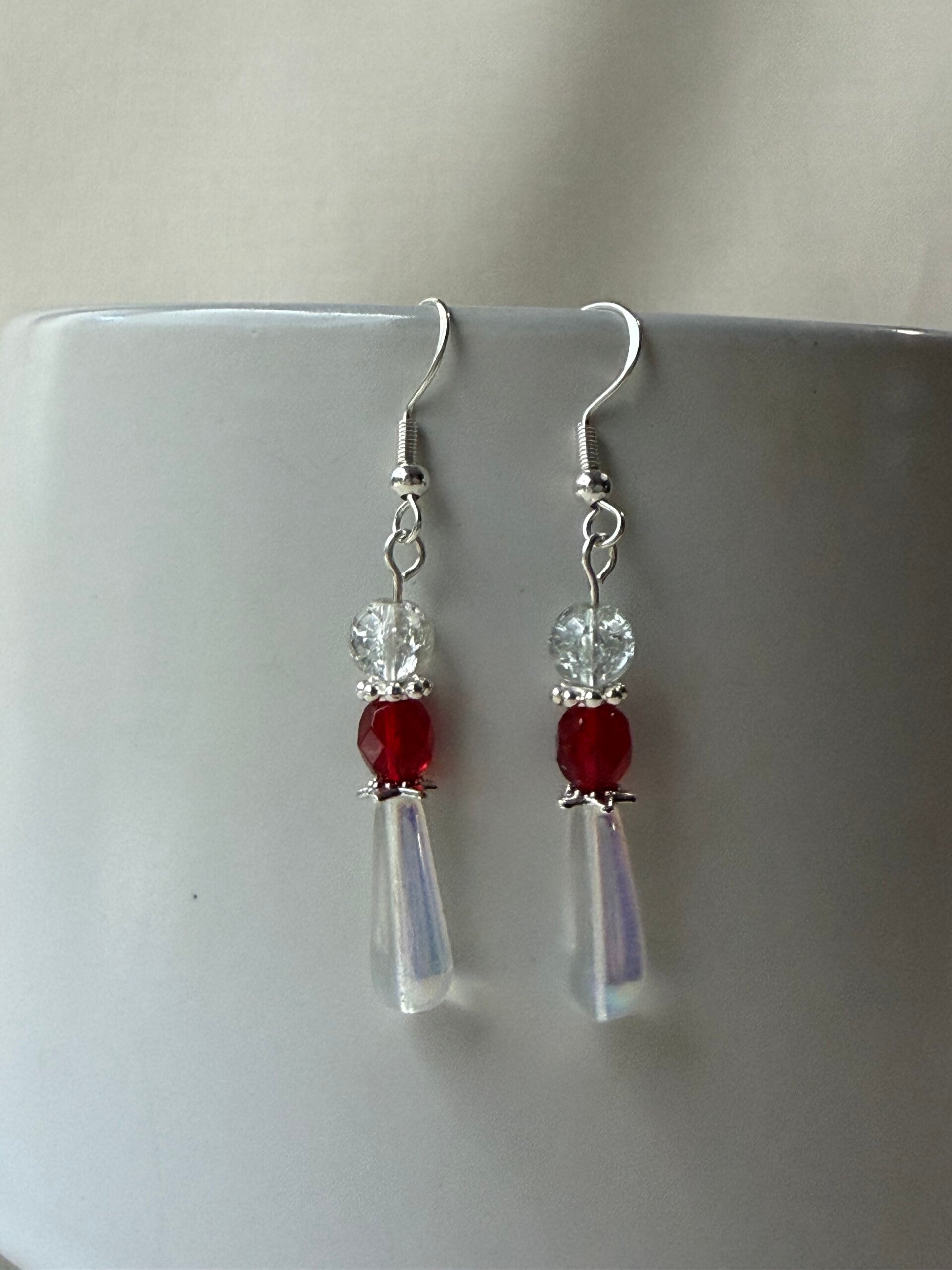 Bold winter color meets elegant sparkle in these handcrafted glass bead earrings. Featuring deep red faceted crystal beads paired with clear glass accents and an iridescent teardrop finish, this design adds warmth and seasonal shine without feeling heavy. Finished with sterling silver fish hook ear wires for comfortable wear.