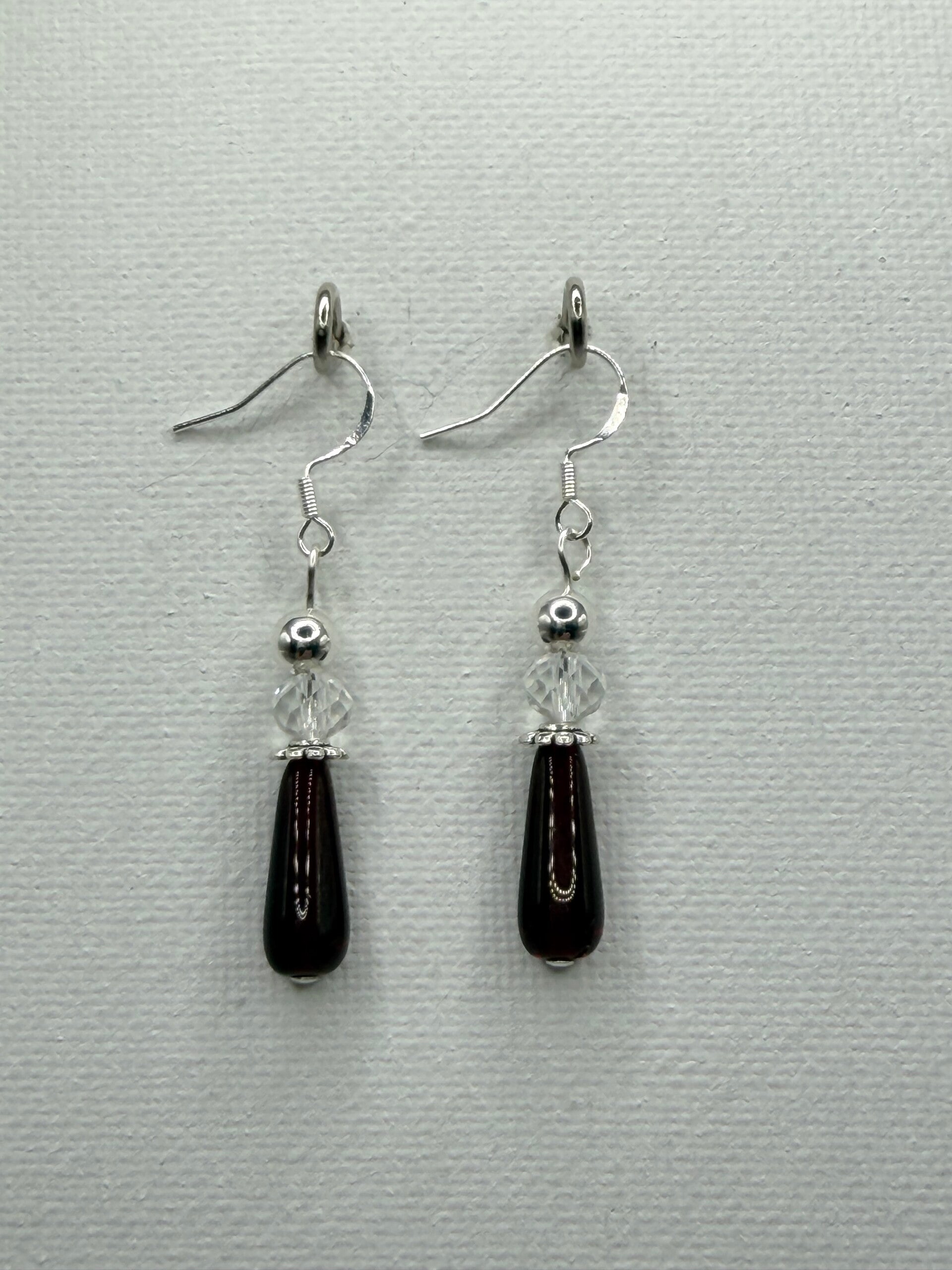 Soft pearl tones meet rich garnet-red glass in this refined Valentine earring design. Finished with elongated silver-tone accents, these earrings offer graceful movement and subtle shine. Handcrafted with sterling silver fish hook ear wires, they remain lightweight and comfortable while adding elegant Valentine warmth to everyday or dressy looks.