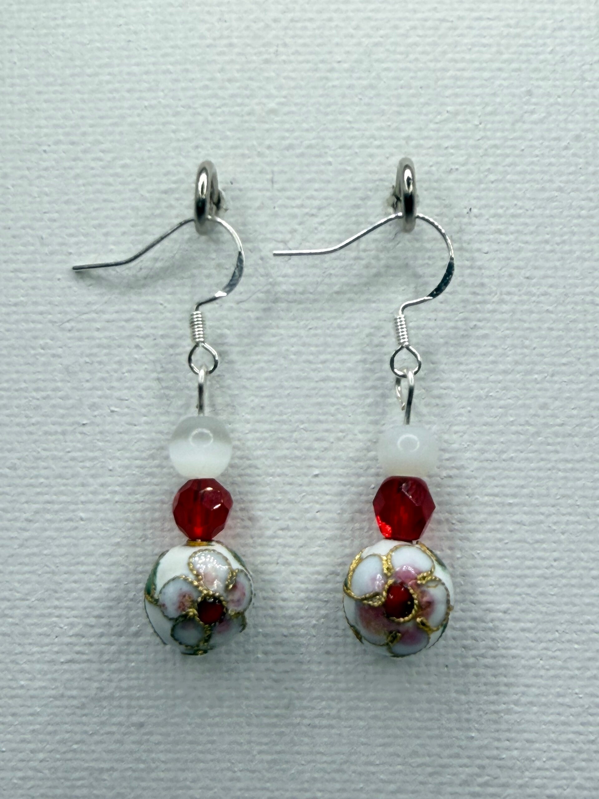 These romantic Valentine drop earrings feature a hand-painted white cloisonné glass bead accented with soft floral detailing, paired with a faceted ruby-red glass bead and a smooth white glass accent. Finished with sterling silver fish hook ear wires and silver-tone findings, this lightweight design blends classic romance with everyday elegance. Perfect for Valentine’s Day, spring styling, or gifting to someone who loves delicate floral jewelry.