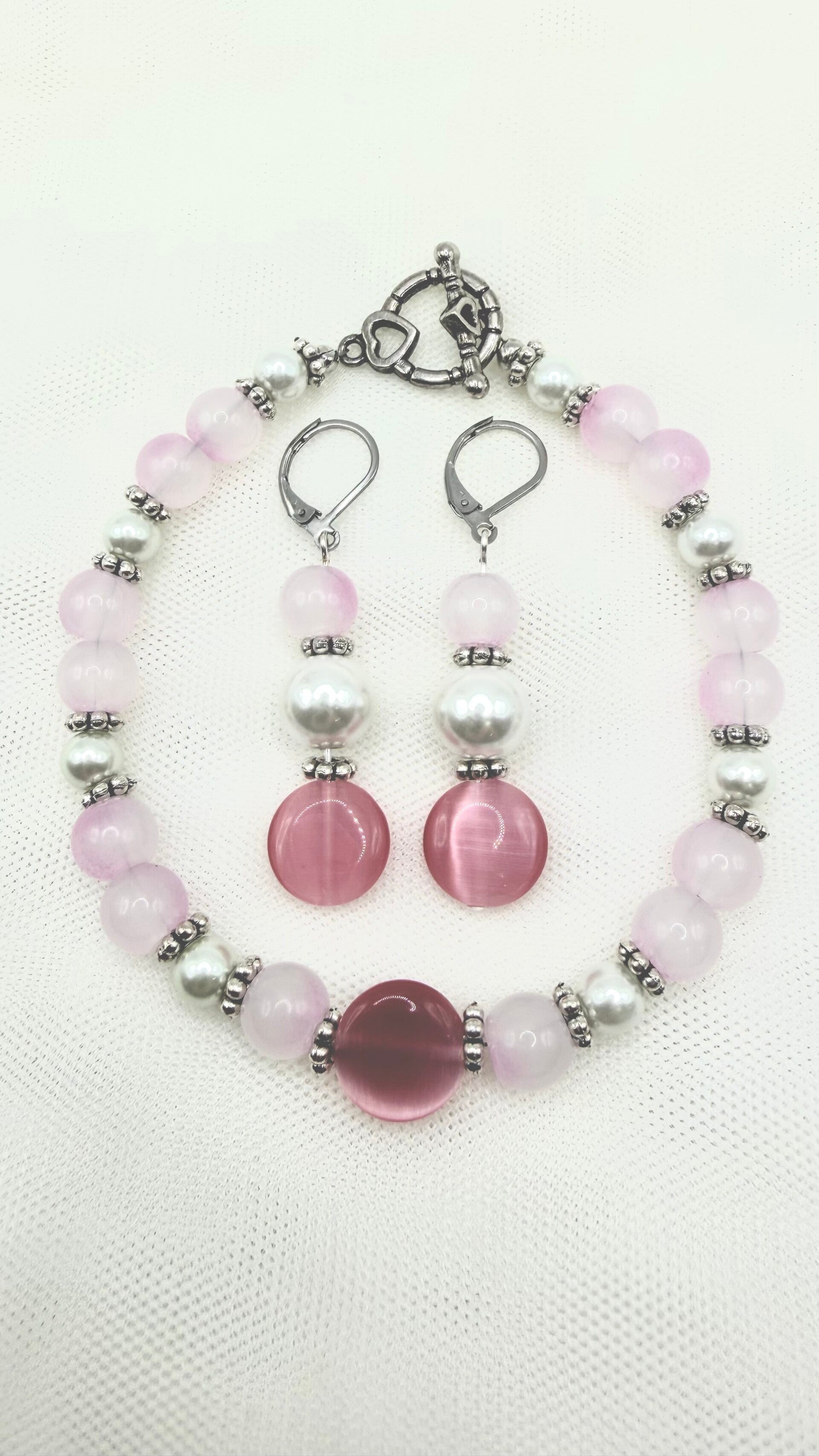 Soft, feminine, and effortlessly elegant, the Blush Radiance Bracelet & Earring Set features luminous pink glass beads paired with shimmering pearl accents and a striking rose-toned cat’s eye focal bead. Silver-tone spacers add texture and dimension, creating a balanced and sophisticated design perfect for both everyday wear and special occasions. This handcrafted jewelry set offers a romantic color palette that complements spring and summer wardrobes while adding a graceful, polished finish.