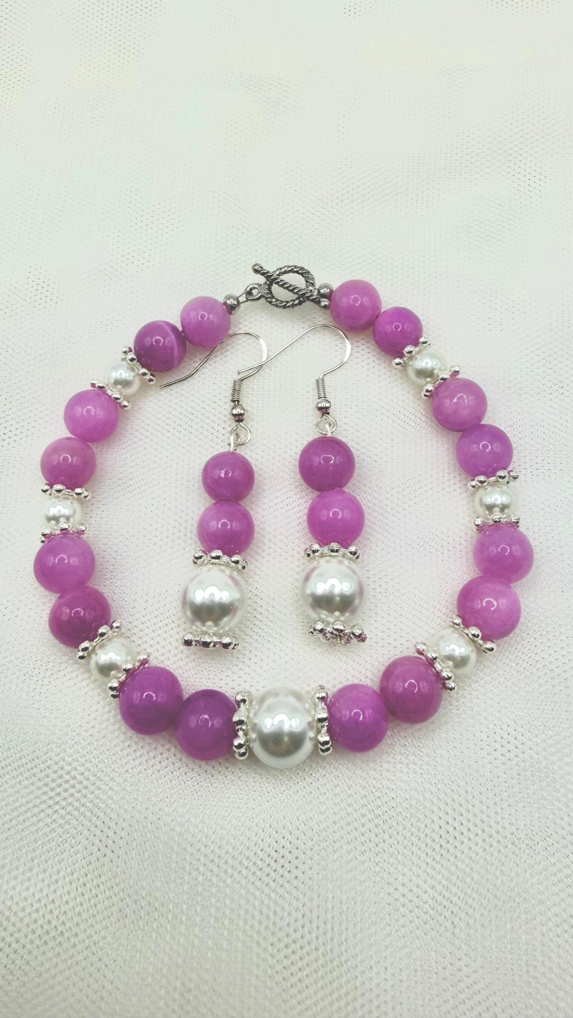 Make a statement with the Berry Glow Bracelet & Earring Set, featuring vibrant magenta-toned glass beads paired with luminous pearl accents. This bold yet elegant design is handcrafted to stand out, offering a striking pop of color while maintaining a polished and wearable look.