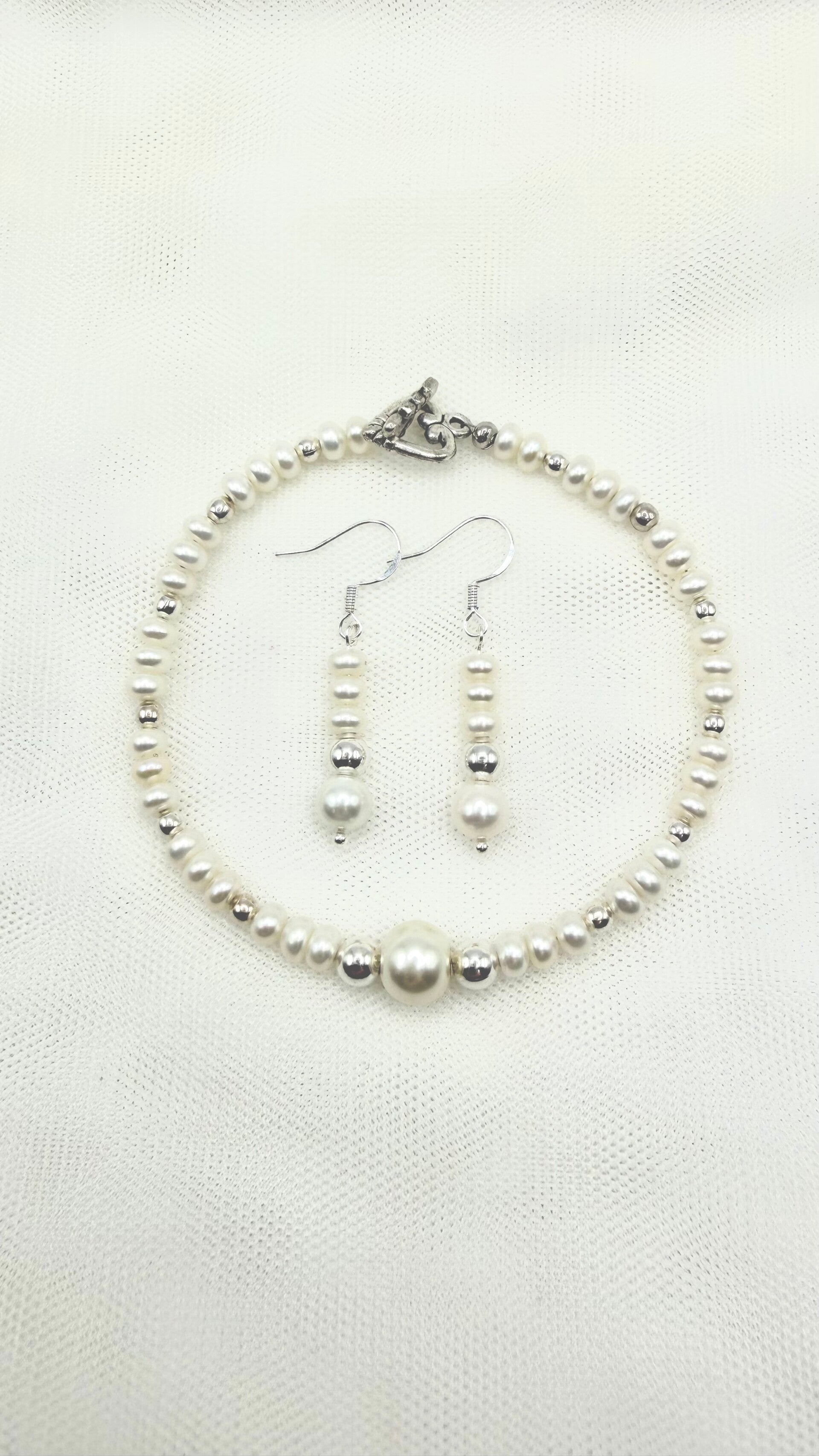 The Timeless Pearl Elegance Bracelet & Earring Set features delicate ivory pearls accented with silver-tone beads for a clean, minimalist look. This handcrafted set is perfect for weddings, formal events, or anyone who loves classic, refined jewelry.
