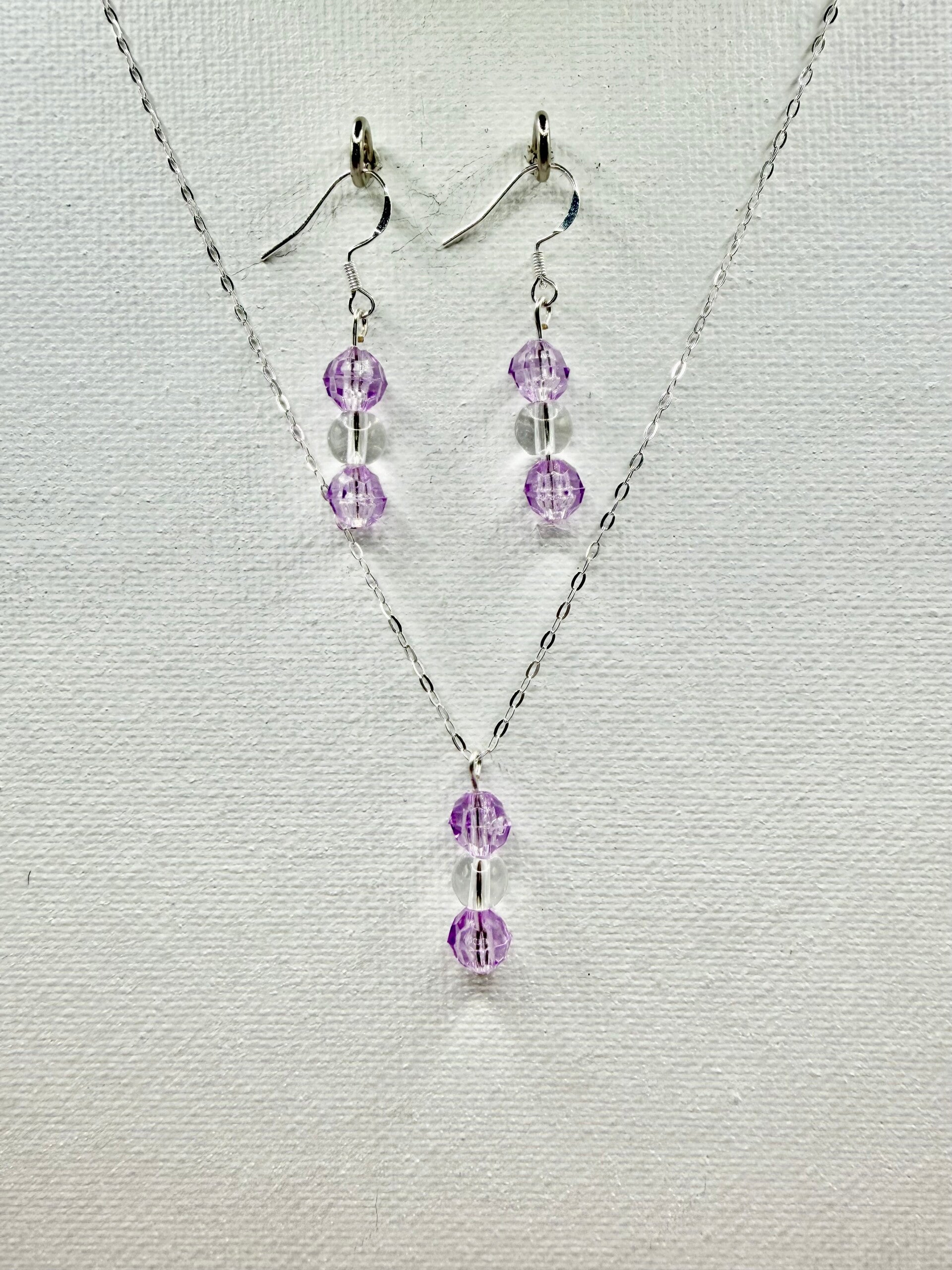 - Necklace: Silver-tone chain with lavender faceted glass bead drop